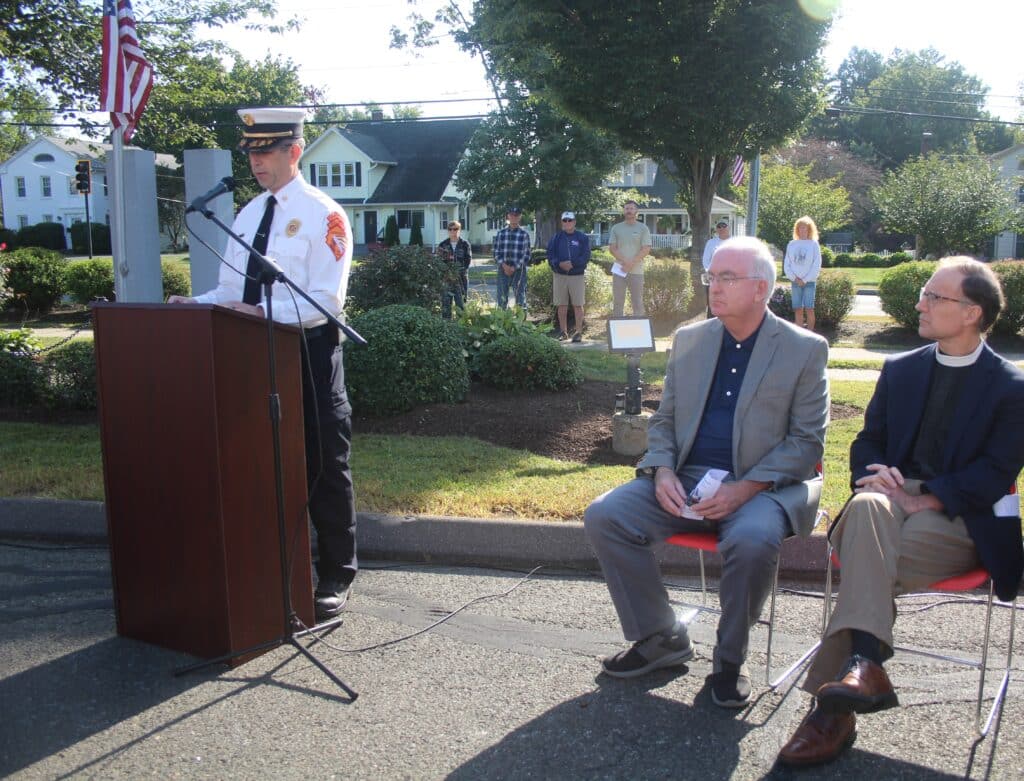 Last to speak was the Rev. Bill Hamilton, the Fire Department chaplain. He said that on Sept. 11, 2001, he was on a retreat with priests from the Diocese of Springfield. In the middle of Mass, he said someone walked into their chapel and told them a plane hit a tower in New York. They thought it was an accident. When they saw a second plane hit the World Trade Center on TV, they knew it wasn’t an accident.