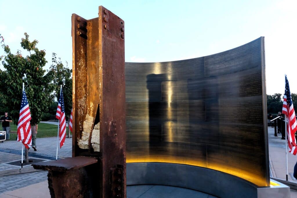 As the sun set, lights illuminated the memorial’s I-beam and cast shadows of the twin towers on a bronze wall, enscribed with the names of the 498 first responders who died that day.