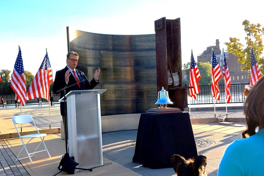 American Medical Response Regional Director Patrick Leonardo reminded those gathered that Springfield “was not untouched by Sept. 11,” and that local people lost loved ones. Referring to the memorial, he said that it “reminds us that, even in the darkest times, we can find light in community.”